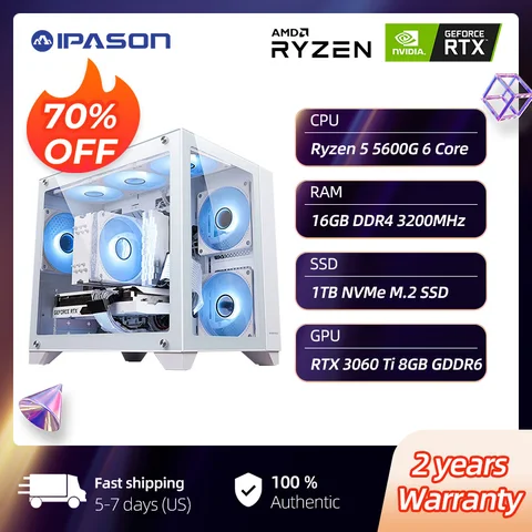 IPASON Gaming Desktop AMD Ryzen 5 5600G 6 Core 3.9GHz RTX 3060 Ti 16GB 1TB SSD M.2 NVMe Windows 11 Home WIFI Gaming PC