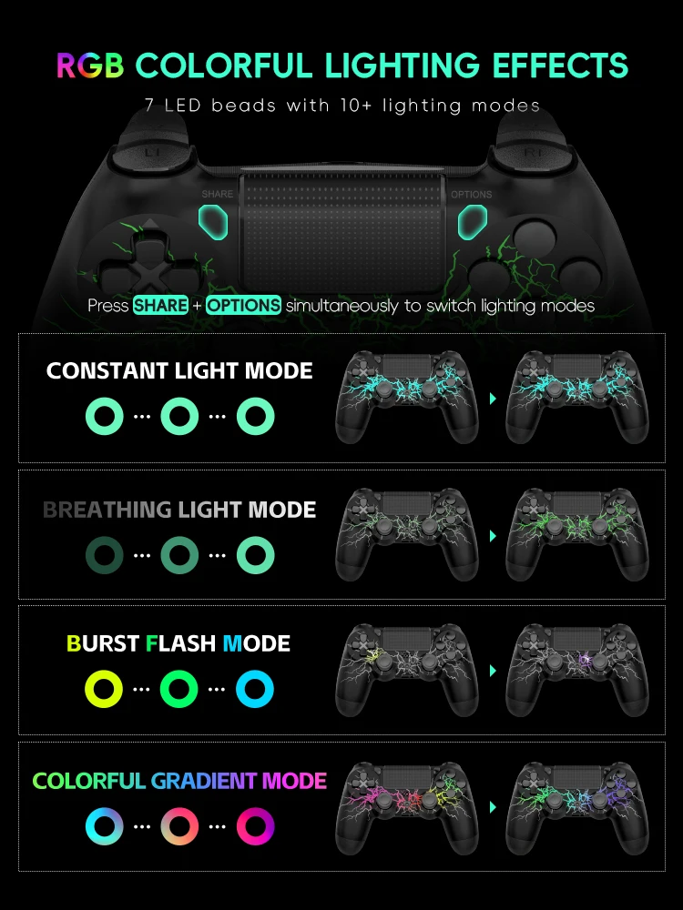 Wireless PS4 Controller for PS4/PRO/SLIM/PC.The PS4 remote joystick has 7 colors of light that can be adjusted via the LED light control button of the PS4 controller, You can switch the color according to different games to immerse yourself deeply in the world of the game.