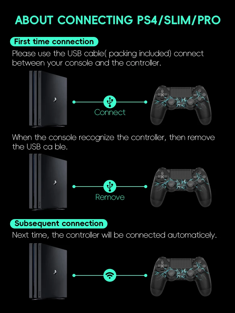 Please Use The Usb Cable( Packing Included) Connect Between Your Console And The Controller. When The Console Recognize The Controller, Then Remove The Usb Cable. Next Time, The Controller Will Be Connected Automaticely.
