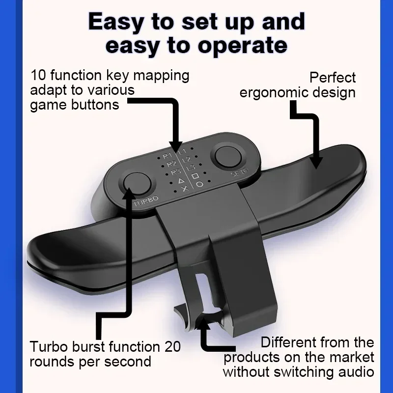 This product is an extension button for the PS4 handle, which can customize the function mapping of the buttons on the back, supports the TURBO burst function, plug and play, and brings users a different gaming experience.