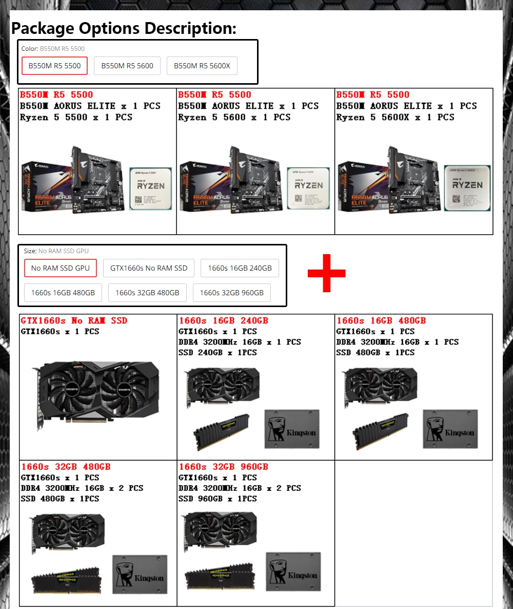 Gaming PC B550M AORUS ELITE Motherboard Ryzen 5 5500 5600 5600X CPU DDR4 3200MHz 960GB GTX1660 Super GPU Desktop PC DIY Set
