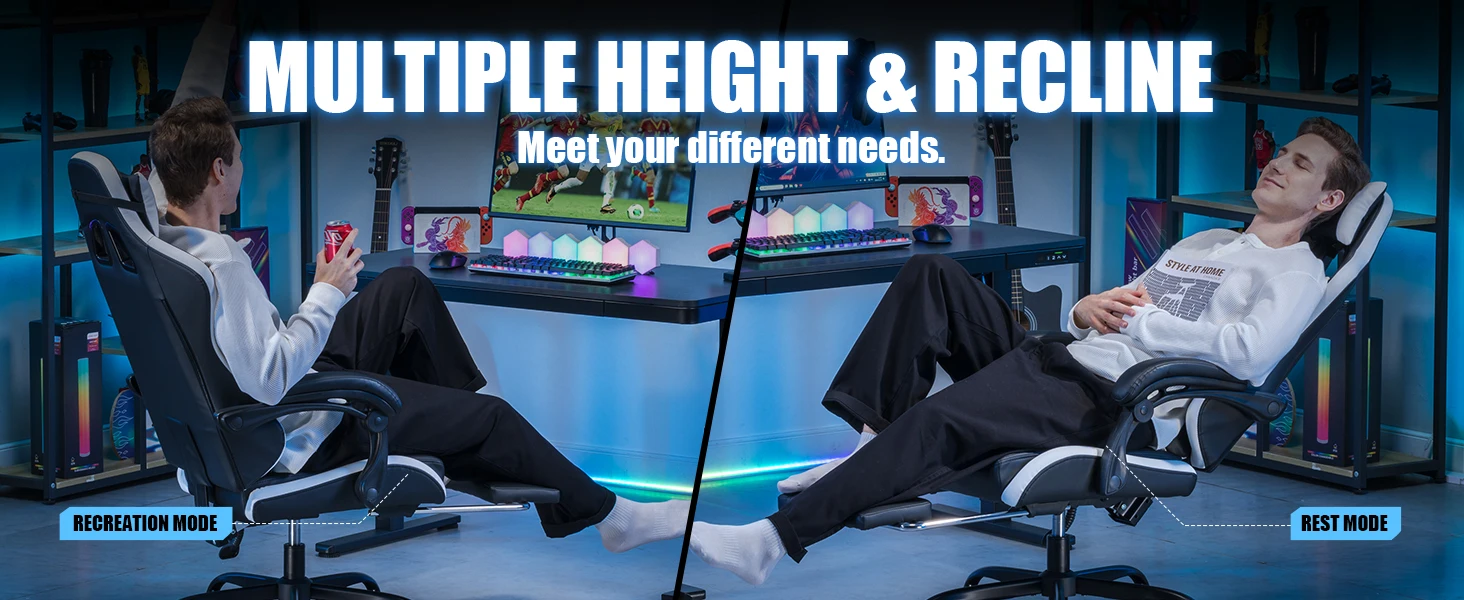 • 【Adjustable & Reclining Design】 Customize your seating position with a height-adjustable seat, reclining backrest, and linked armrests (moves with the backrest). The added footrest lets you kick back and relax between games.