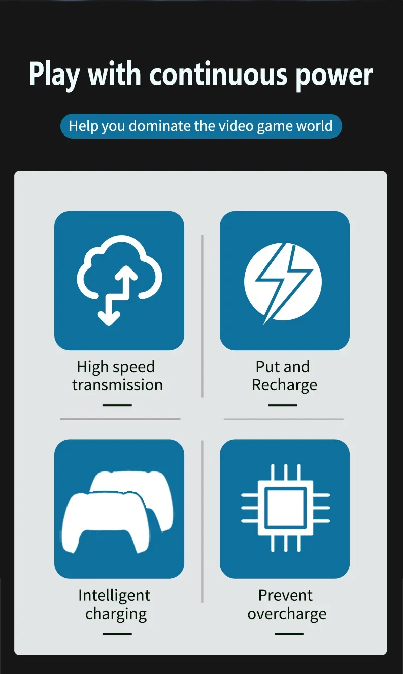 5. Anti-oxidation metal probe for fast charging, it takes about only 2 hours to fully charged two controllers at the same time .