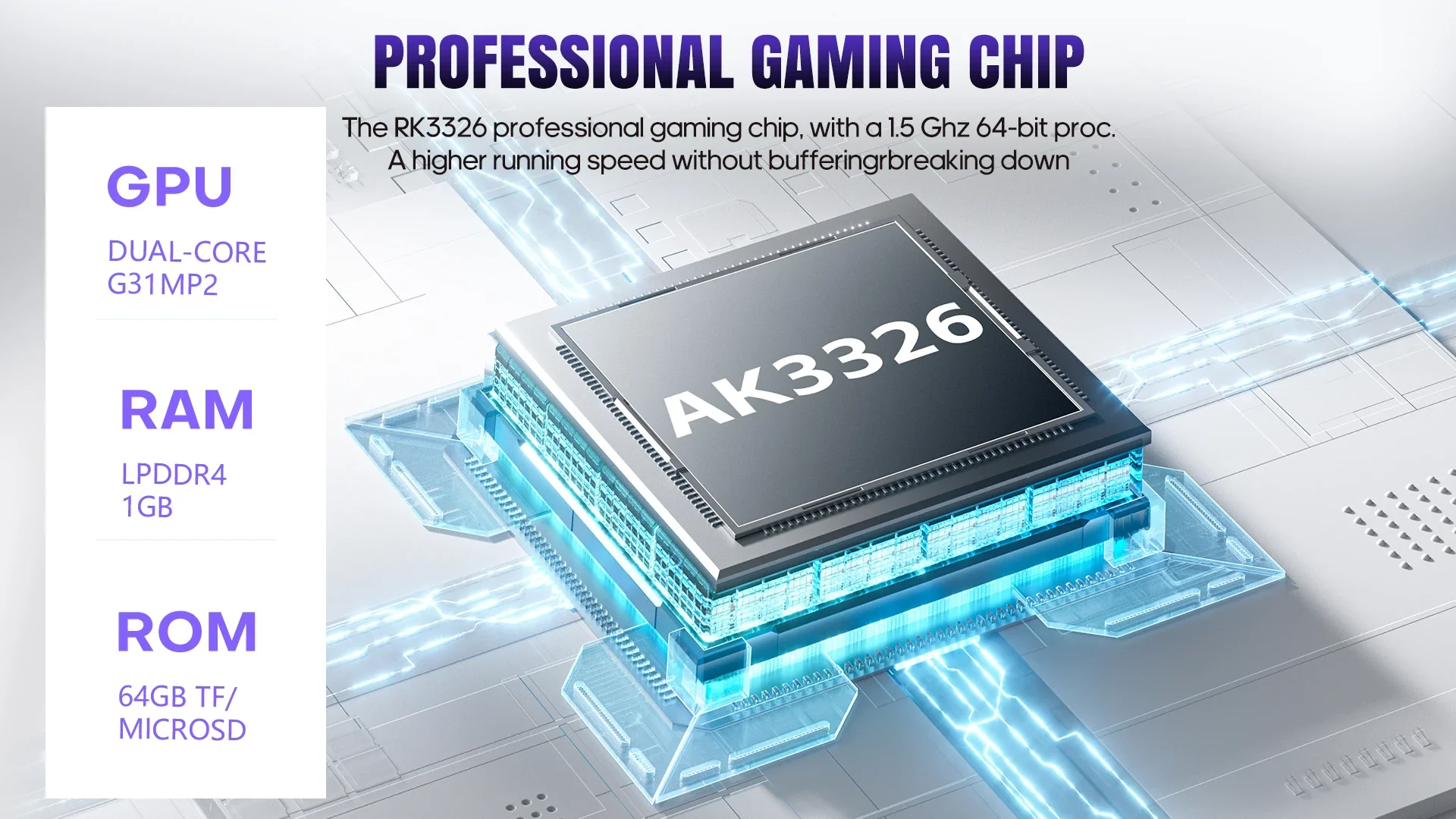 The RK3326 professional gaming chip ,with a 1.5 Ghz 64-bit proc.