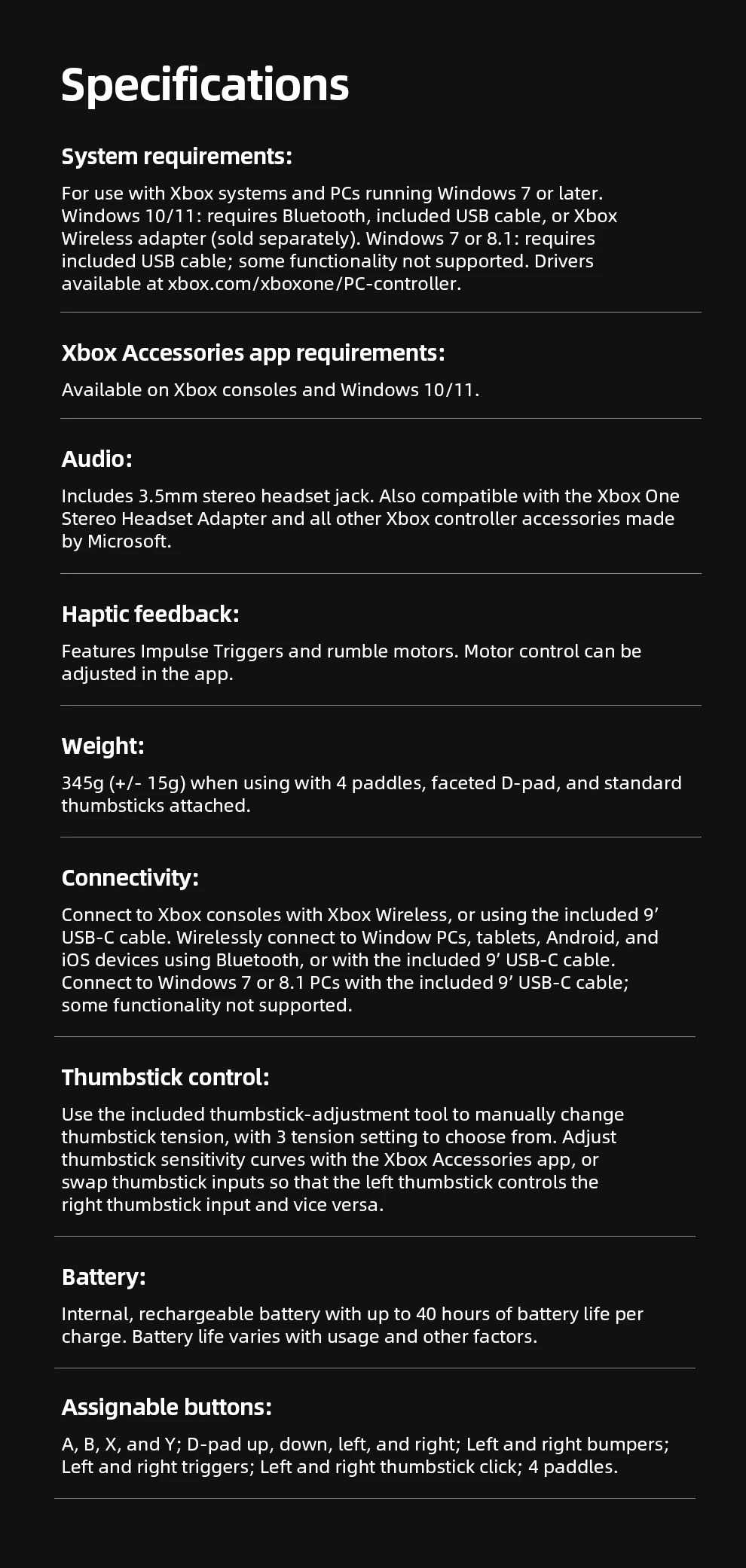 • Compatible with Xbox Series X|S, Xbox One, and Windows 10/11 devices